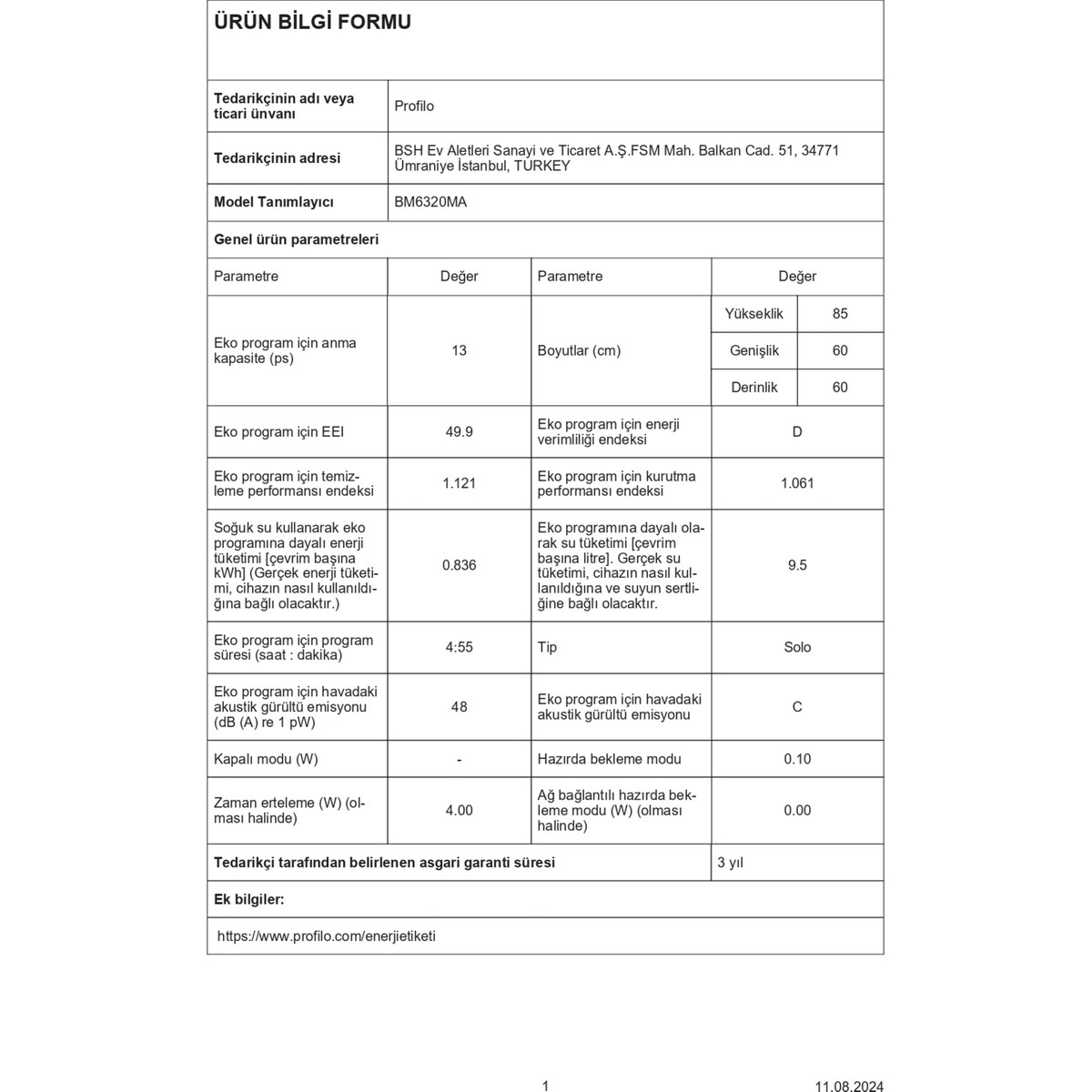 Profilo BM6320MA D Enerji Sınıfı 6 Programlı Bulaşık Makinesi