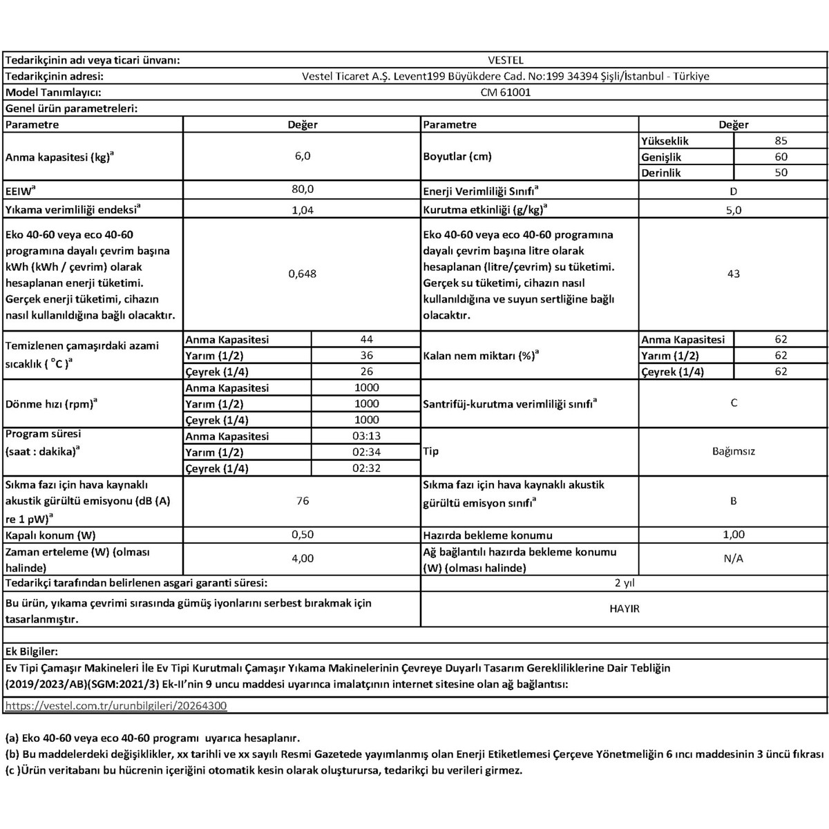 Yıllık Enerji Tüketimi (kWh/Yıl) : 65