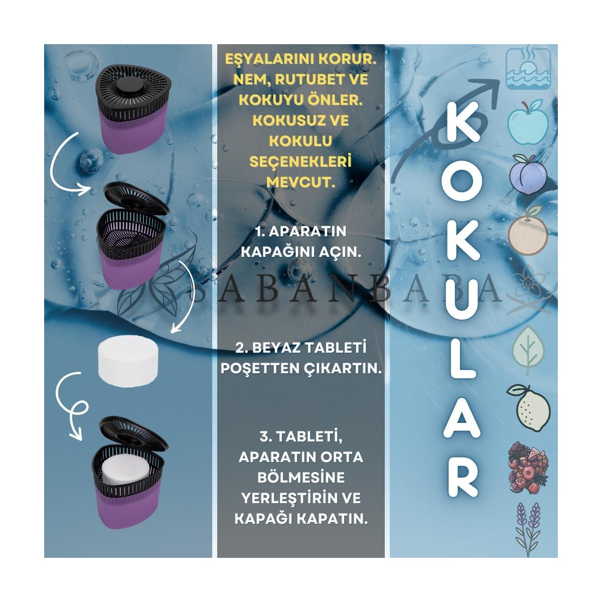 Saban Nem Alıcı & Rutubet Giderici Aparat ve Tablet Seti, yaşam alanlarınızda oluşabilecek nem ve rutubet problemlerine karşı etkili bir çözümdür. Özel olarak geliştirilmiş tablet yapısı sayesinde ortamın nem oranını dengeler, kötü kokuları önler ve küf oluşumunu engeller.