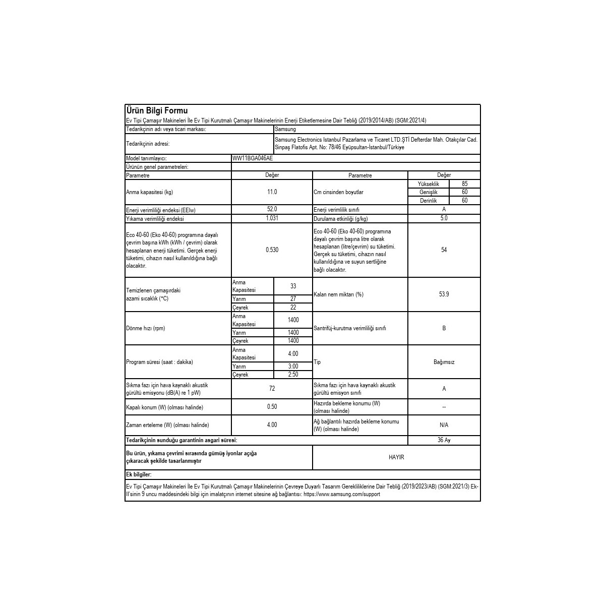 Samsung WW11BGA046AEAH 11 Kg 1400 devir Çamaşır Makinesi ile çamaşır yıkamak artık daha etkili ve keyifli! Bu makine, geniş kapasitesi ve yüksek performansıyla evinizdeki temizlik işlerini kolaylaştırır. 11 kg yıkama kapasitesi sayesinde büyük aileler için ideal olan bu çamaşır makinesi, her yıkamada mükemmel sonuçlar sunar. Beyaz rengin zarafetiyle mutfağınıza veya çamaşır odanıza şıklık katar. Dijital kontrol paneli ile kullanım kolaylığı sağlar ve her yıkamada istediğiniz sonuçları elde etmenizi mümkün kılar. 1400 devir hızı ile çamaşırlarınızı daha kısa sürede kurutur, böylece zamandan tasarruf edersiniz. Enerji verimliliği ile dikkat çeken bu makine, hem çevre dostu hem de bütçe dostudur. Sessiz çalışma özelliği sayesinde evinizde huzuru bozmadan çamaşırlarınızı yıkayabilirsiniz. Modern tasarımı ve üstün teknolojisi ile bu çamaşır makinesi, evinizin vazgeçilmez bir parçası olmaya aday.