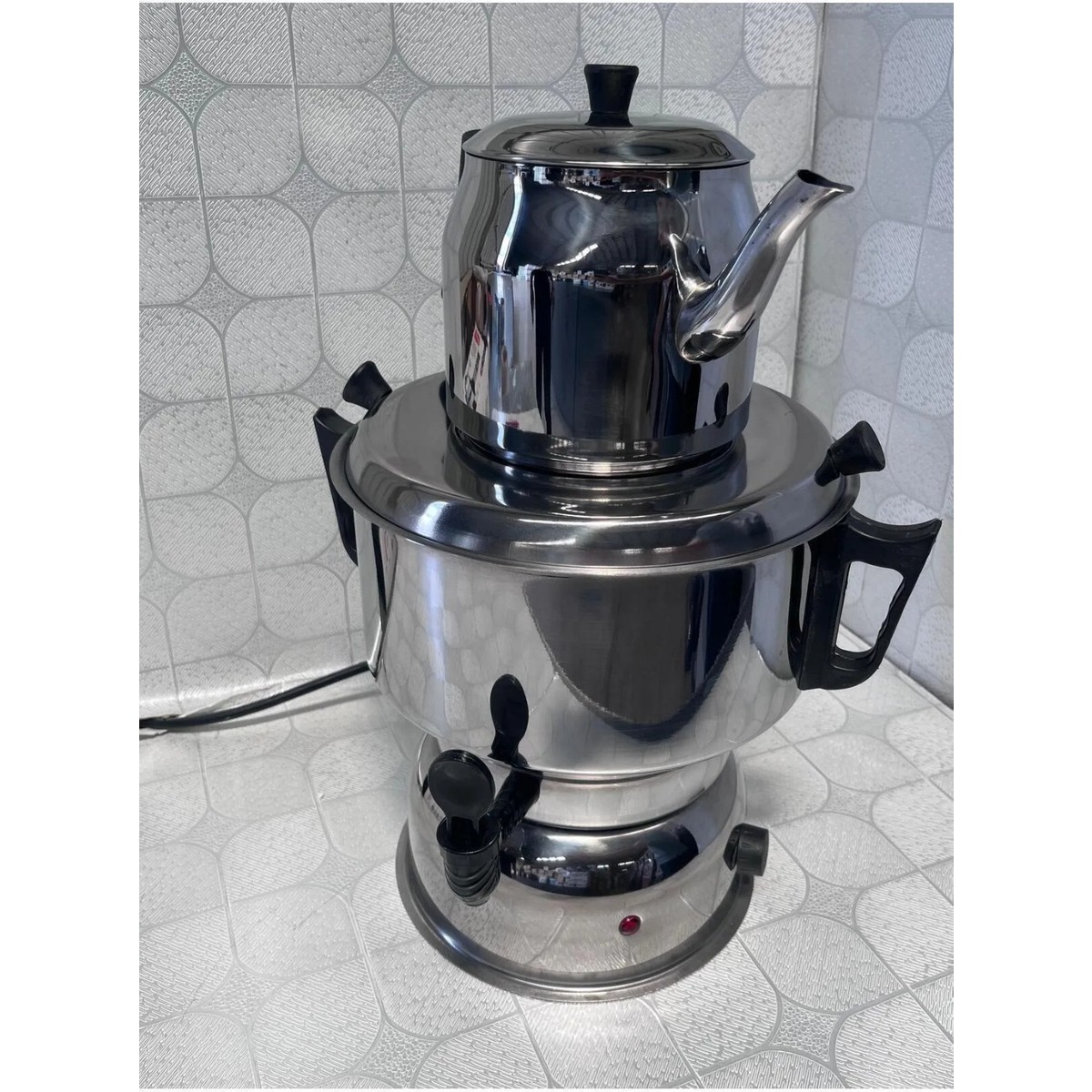 Seçil markasının kalite ve dayanıklılığıyla üretilmiş olan 70 bardak kapasiteli elektrikli semaver, kalabalık ortamlarda uzun süreli kullanıma uygun olarak tasarlanmıştır. Paslanmaz çelik gövdesi, hem hijyenik hem de uzun ömürlü kullanım sunarken, ergonomik tasarımı ile kullanıcı dostudur.