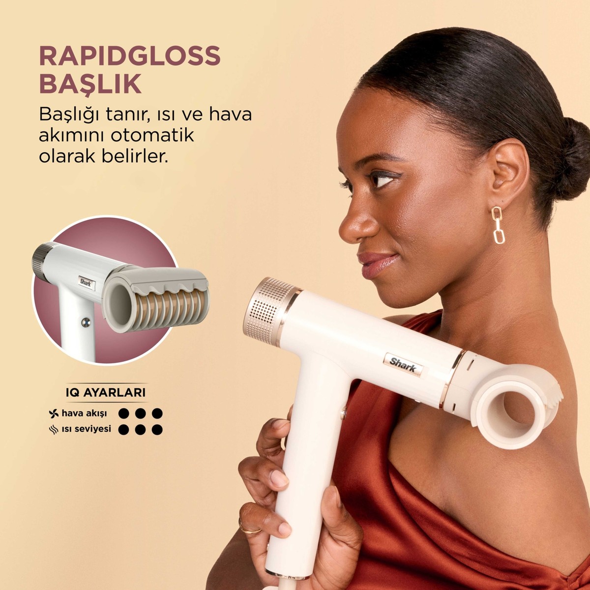 Ultra hızlı şekillendirme için Shark® SpeedStyle™ saç kurutma setindeki aksesuarların her birini kullanırken sıcaklık ve hava akımı ayarlarını otomatik olarak ayarlayabilirsiniz.