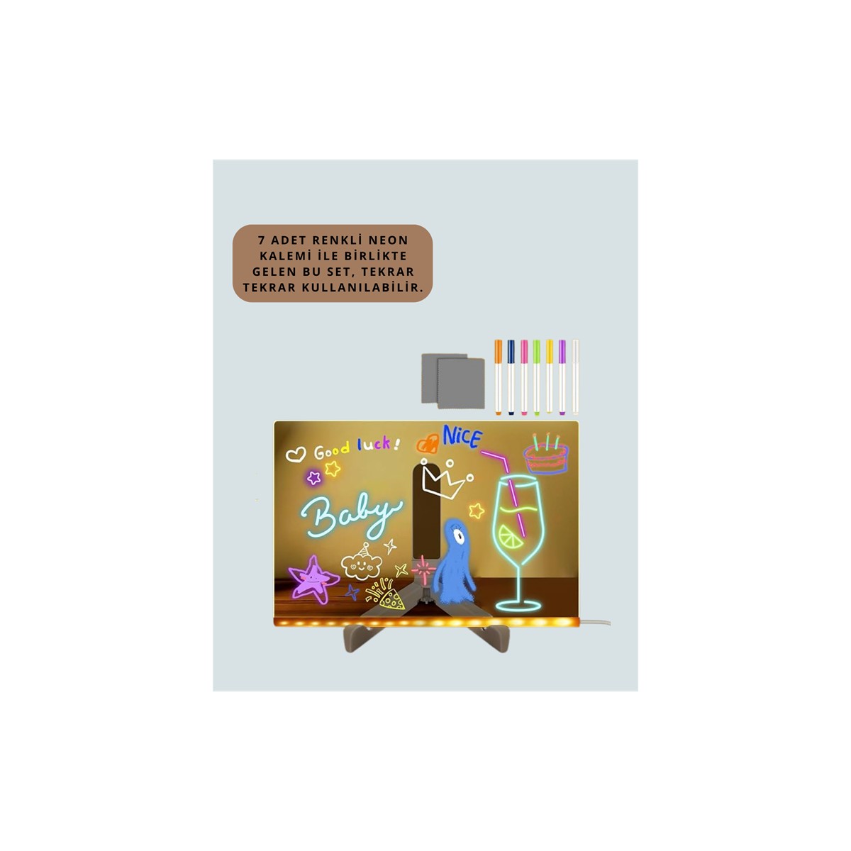 Günlük hayatınızı düzenlerken estetikten de vazgeçmeyin! Bu LED ışıklı akrilik pano, minimalist tasarımı ve neon ışıklarıyla evinize ya da ofisinize modern bir dokunuş getirir.Yazı tahtası olarak kullanılabileceği gibi, planlayıcı, yapılacaklar listesi veya not panosu olarak da görev yapabilir. Mutfakta alışveriş listesi, salonda günün sözü ya da çalışma masanızda günlük hedefler… Nerede olursa olsun dikkat çeker ve işlevsellik sunar.Ürünle birlikte gelen 7 adet renkli neon kalemle yazılarınızı her gün farklı bir şekilde vurgulayabilirsiniz. Silinmesi son derece kolaydır ve tekrar tekrar kullanılabilir. Dayanıklı akrilik malzeme sayesinde uzun ömürlü kullanım sağlar.