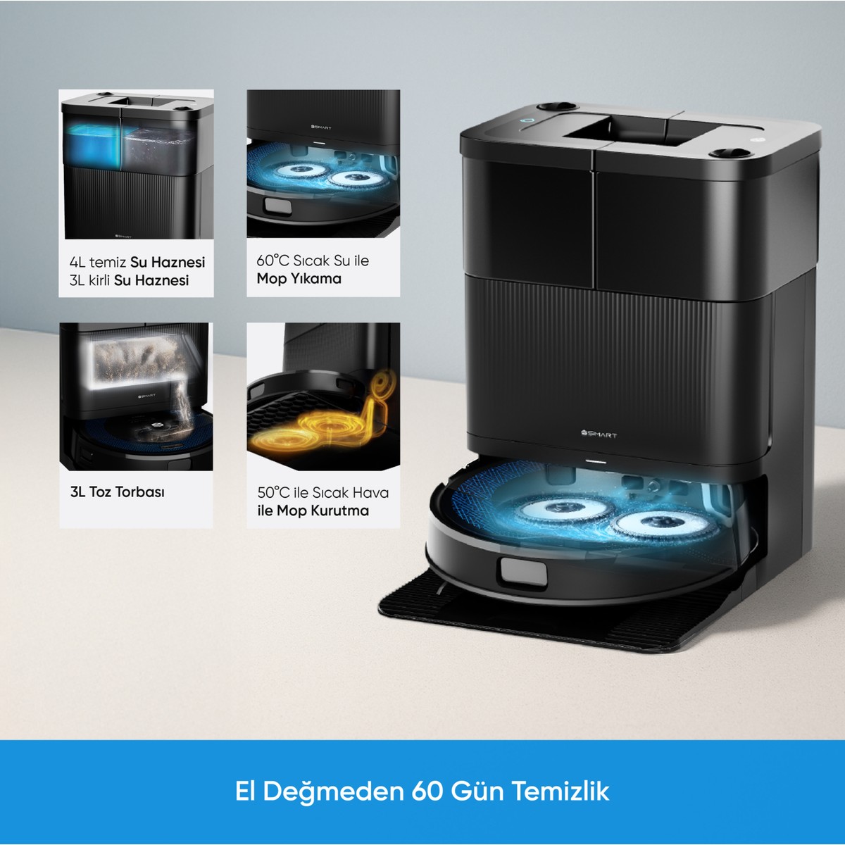Temizlik sonunda robot istasyona döner, 15 saniyede toz haznesini boşaltır. Toz torbası 60 güne kadar değişim gerektirmez.
