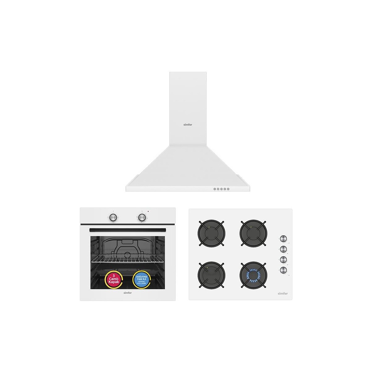 Simfer 4 Fonksiyon Trend Beyaz Cam 3’lü Ankastre Set (Fırın + Ocak + Davlumbaz)