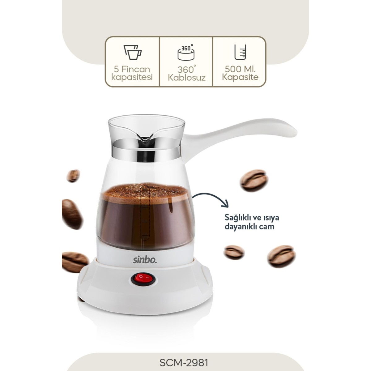 <p><strong>Sinbo SCM-2981 Elektrikli Cam Cezve</strong> — <strong>hızlı ve pratik Türk kahvesi</strong hazırlamak için ideal bir yardımcı. Şık tasarımı ve <strong>güvenilir özellikleri</strong> ile kahve keyfinizi bir üst seviyeye taşıyor.</p><p>✨ Özellikler:<br>- ✅ <strong>5 fincan kapasitesi</strong> — misafirlerinizi ağırlamak için yeterli.<br>- 🔒 <strong>Isıya dayanıklı cam</strong> — güvenli ve sağlıklı kullanım sağlar.<br>- ⚡ <strong>Hızlı su kaynatma</strong> — zamandan tasarruf etmenizi sağlar.<br>- 🔌 <strong>Kablosuz kullanım</strong> — her açıdan rahatlık sunar.<br>- 🔒 <strong>Aşırı ısınma emniyet sistemi</strong> — güvenli bir deneyim için.</p><p><strong>Türk kahvesi severler</strong> ve <strong>pratik çözümler</strong> arayanlar için mükemmel bir seçimdir — evde, ofiste veya misafirlikte her zaman yanınızda!</p>