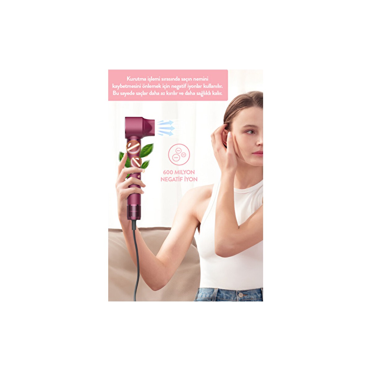 5’ı 1 Arada Çok Fonksiyonlu Saç Kurutma ve Şekillendirme Cihazı: 110.000 RPM –1600W  600 MİLYON NEGATİF İYON Saç kurutma, düzleştirme, bukle yapma, dalgalandırma, hacim kazandırma ve tarama işlemlerini tek cihazla sunar. Çıkarılabilir Başlıklar: Farklı saç şekillendirme ihtiyaçlarına uygun çeşitli başlık seçenekleri ile kullanımda esneklik sağlar. İyonik Teknoloji: Saçın elektriklenmesini önleyerek daha pürüzsüz ve parlak bir sonuç elde edilmesine yardımcı olur. Seramik Kaplama: Saçı yüksek ısının zararlarından korur ve saçın doğal nemini muhafaza eder. Hızlı Kurutma Fonksiyonu: Güçlü motoru ile saçları hızlı bir şekilde kurutarak zamandan tasarruf sağlar. Ergonomik ve Hafif Tasarım: Kolay taşınabilir ve kullanımda konfor sağlayan hafif yapısı ile günlük kullanım için idealdir.
