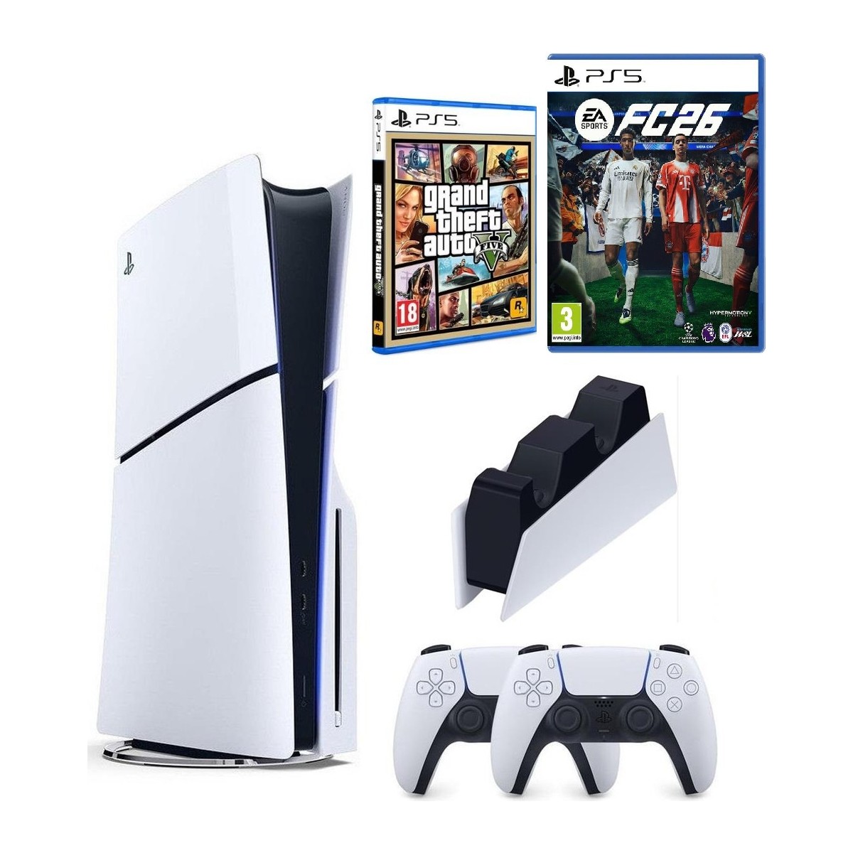 Sony Playstation 5 Slim +2.kol Dualsense +Şarj Istasyonu +Ps5 FC26 + Gta V ( Ithalatçı Garantili)