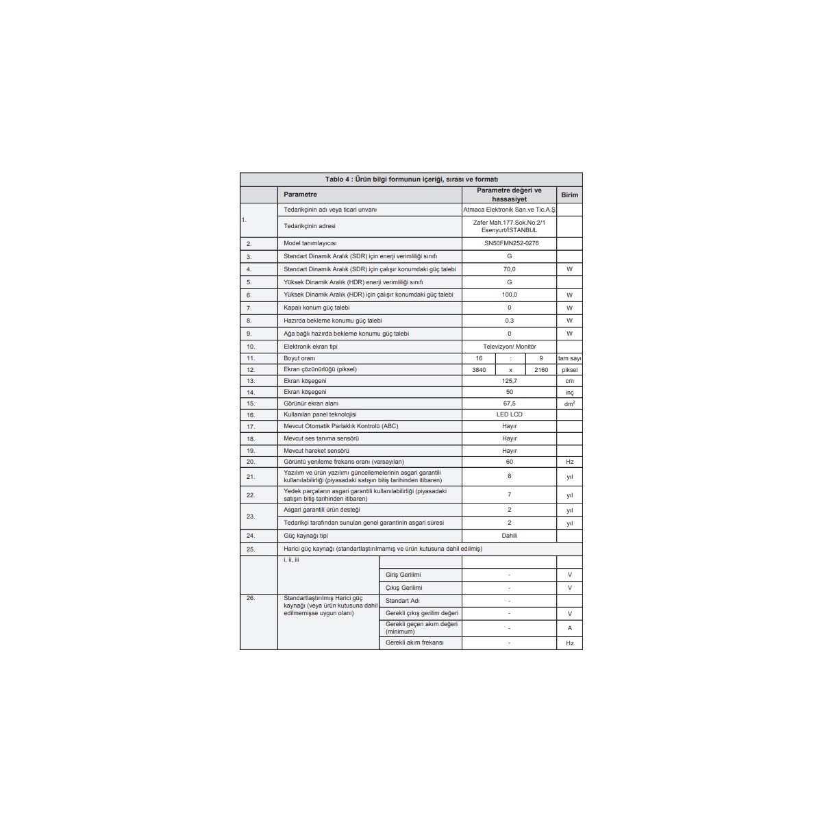 • Enerji sınıfı G (HDR modu) ve yaklaşık 70 kWh/1000 saat tüketimiyle standart 4K TV sınıfında yer alır.