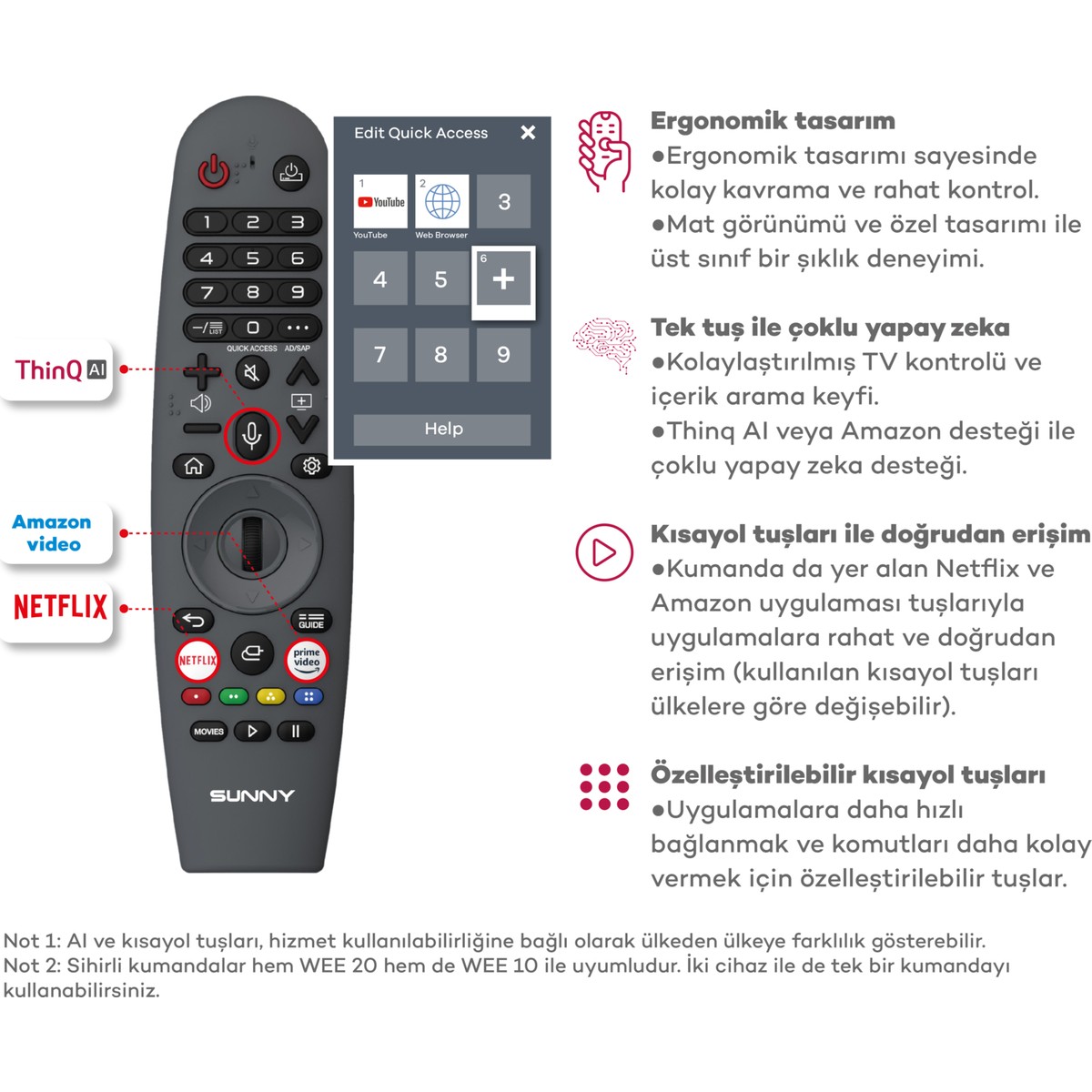 • LG destekli webOS 2.0, güçlendirilmiş yapay zeka ve Türkçe sesli komut özelliğine sahiptir; içerik arama ve navigasyon oldukça sezgiseldir.