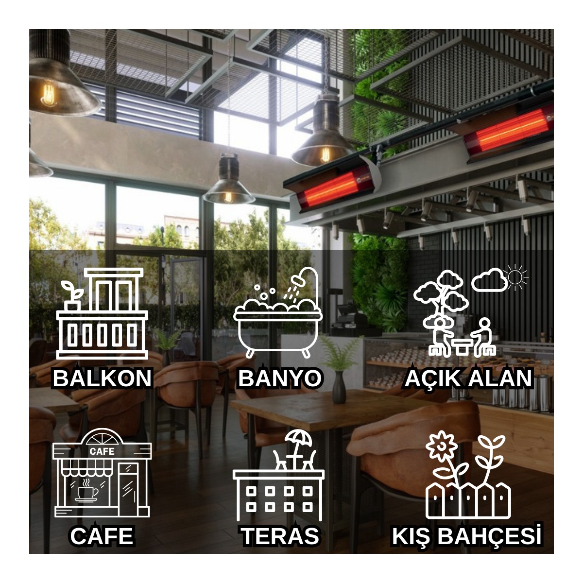 Sunstar yeni nesil uzaktan kumandalı 6 kademeli. Devrilme Emniyetli. Açık ve kapalı alanları (cafe, spor salonu, restaurant, otel, bahçe, kışlık, ev, ofis, vb) daha az maliyetle ısıtın; Yeni Nesil Isıtıcı Rüzgardan ve Hava Akımından Etkilenmez Diğer Sistemlere Göre %80 Daha Verimli Çalışır Açık ve Kapalı Alanları Kolayca Isıtır Voltaj220; 240V Heartz50; 60 Hz Power:1800 W Isıtma Alanı (kapalı alan)8; 10 m2 Isıtma Alanı (açıkalan)6; 8 m2. Boyutları: 60 cm uzunluk, 13 cm yükseklik, 8 cm derinlik. 2 yıl garantilidir.