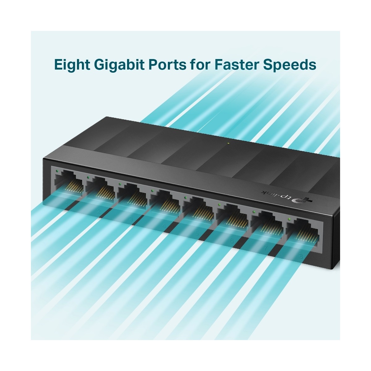 LS1008G 8 portlu Gigabit masaüstü switchle ağınızın hızını artırın.8 × 10/100/1000Mbps portlar, büyük, bant genişliği yoğun dosyaların parazit olmadan anında aktarılmasını sağlar.