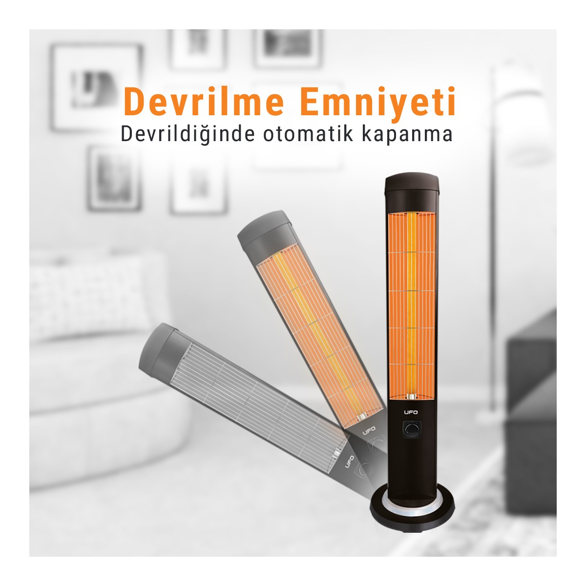Kule tipi ısıtıcı modellerinde devrilme emniyeti mevcuttur. 2300 modelinde ek olarak yakın mesafe sensörü de bulunmaktadır. Duvar tipi ısıtıcılar stand ile birlikte kullanıldığında devrilme emniyeti mevcuttur. Devrilme emniyeti aktif olduğunda ısıtıcı otomatik olarak kapanır.