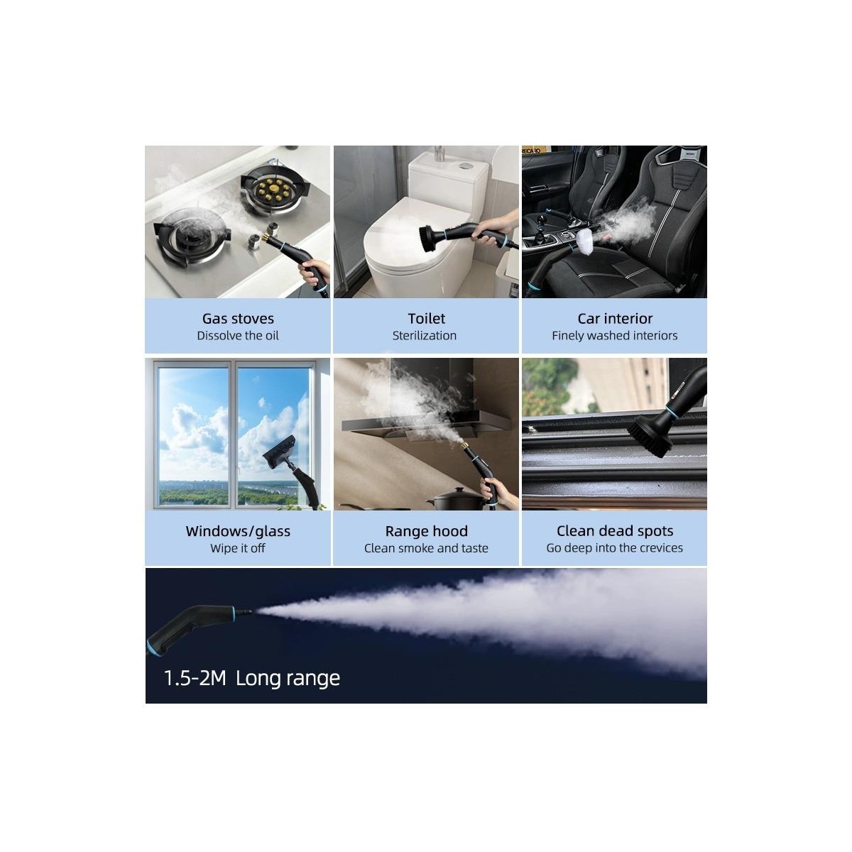 1,5 – 2 Metre Uzun Menzil: Güçlü buhar çıkışı ile geniş yüzeyleri hızlıca temizler.