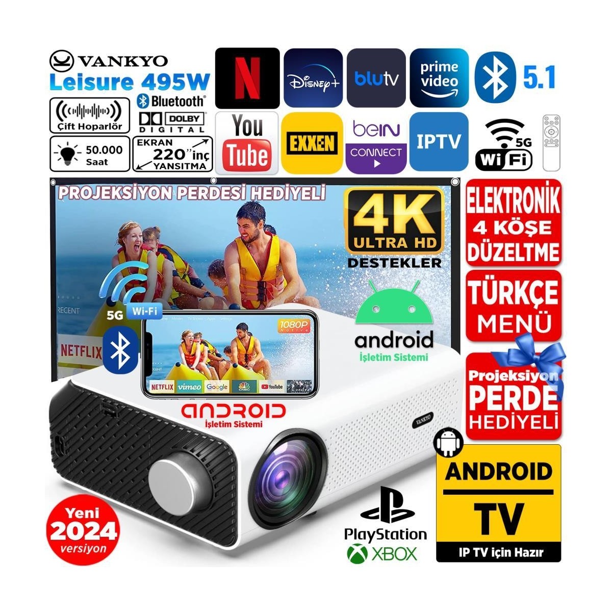 Vankyo Leisure 495W Android 4K Destekli 5G Wi-Fi + 5.1 Bluetooth LCD LED Projeksiyon Cihazi – 220 İnç Yansıtma – HiFi Dolby Ses Sistemi