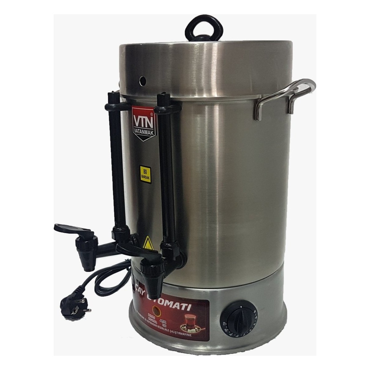 Vatan 250 Bardak Çay MakinesiVatan 250 Bardak Çay Makinesi & Çay Otomatı & Semaver-304 Krom 18/10 paslanmaz çelikten üretilmiştir.-Gövdesi ve süzgeci paslanmaz çeliktir.-Çay lezzetinin uzun süre bozulmamasını sağlar.-Toplu tüketim için uygun kullanım sağlar.-Hijyenik ve uzun ömürlüdür.-Otomatik ısı kontrol sistemi ile tasarrufludur.-Isı yalıtımlı kulplar ile taşınabilir.-Suyun ve çayın seviye göstergelerine sahiptir.-Su ısıtma sistemi özel tasarlanmıştır.-Gün boyu bayatlamayan çay demi ve sıcak su verir.-Suyu kaynatan, paslanmayan şok tüp rezistans ile donatılmıştır.