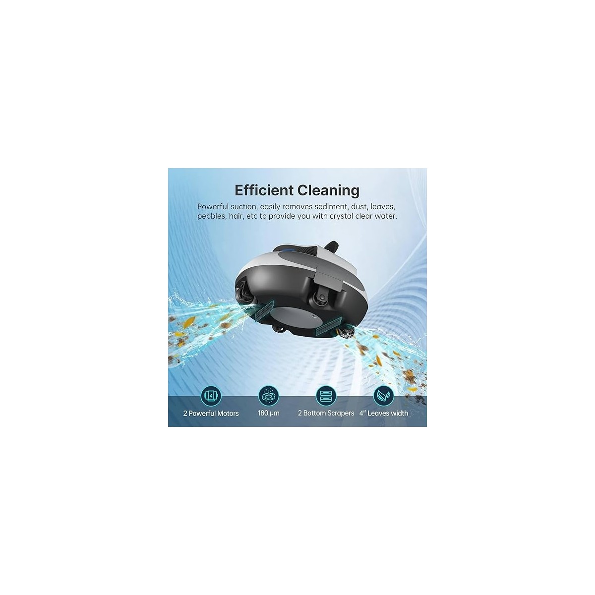 Bu ürün hakkında 1. 【Zahmetsiz Temizlik】 Yeraltı havuzları için bu kablosuz havuz süpürgesiyle karışık kablolara veda edin. Açmak için düğmeye tıklamanız yeterli, 30 saniye içinde suya atın ve su altında çalışmaya başlayacaktır. Yüzme Havuzu Temizlik Robotu Maksimum dalış derinliği 3m. 2. 【Akıllı Park】3D hassas engellerden kaçınma, kablosuz ve dolaşmayan, 42L/MIN büyük emiş gücü, entegre emme ve kazıma. Pil seviyesi azaldığında havuz temizleyiciniz otomatik olarak havuz kenarına park edecek ve birlikte verilen kanca, kıyafetlerinizi ıslatmadan kolayca çekilebilecektir. 3. 【Uzatılmış Temizleme Süresi】 5000mAH Büyük Pil. 1000 ft2’ye kadar havuzlar için 100 dakikaya kadar sürekli temizlik. Maksimum temizleme alanı 1000 ft2 (92㎡). 10°C~35°C su sıcaklığına uyum sağlayın. 4. 【Güçlü Performans】 Güçlü çift motorlar ve çift fırçalarla donatılmış, döküntüleri, yaprakları ve küçük kayaları kolayca süpürebilir ve kazıyabilir, böylece havuzunuzun kapsamlı bir şekilde temizlenmesini sağlar. Çeşitli şekillerdeki havuzlar ve eğimi 15°’den az olan zeminler için uygundur. 5. 【Kullanışlı Özellikler】 Kendi kendine park etme teknolojisi, kolay kullanım. Büyük boyutlu filtreyle 180μm hassasiyet, küçük döküntülerin geçmesine izin vermez. Makineyi açıp yıkamak için dört düğmeyi açmanız yeterli.