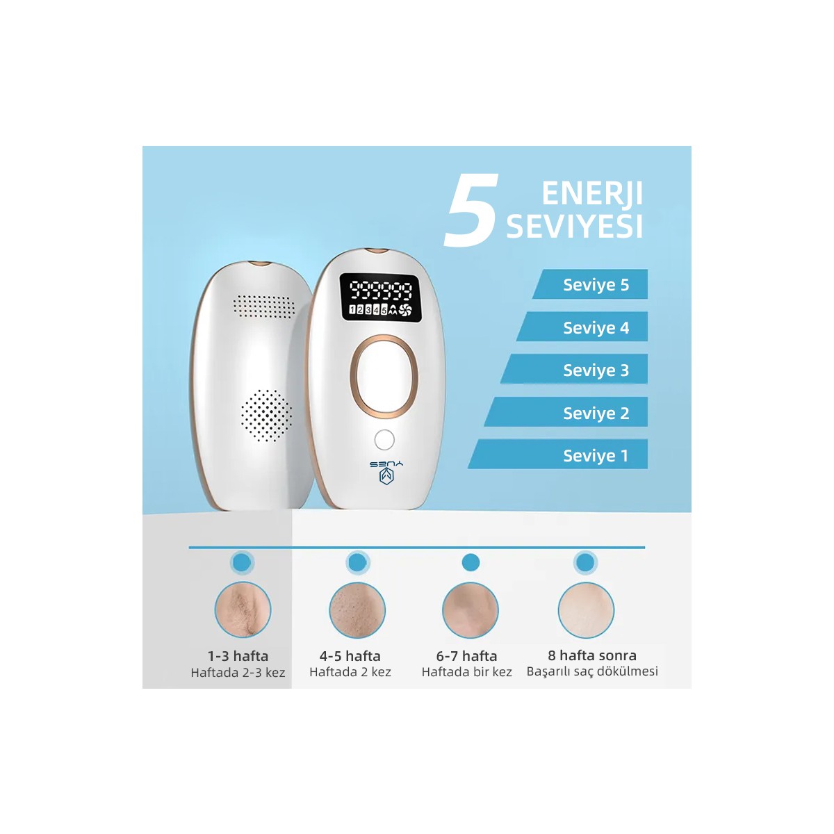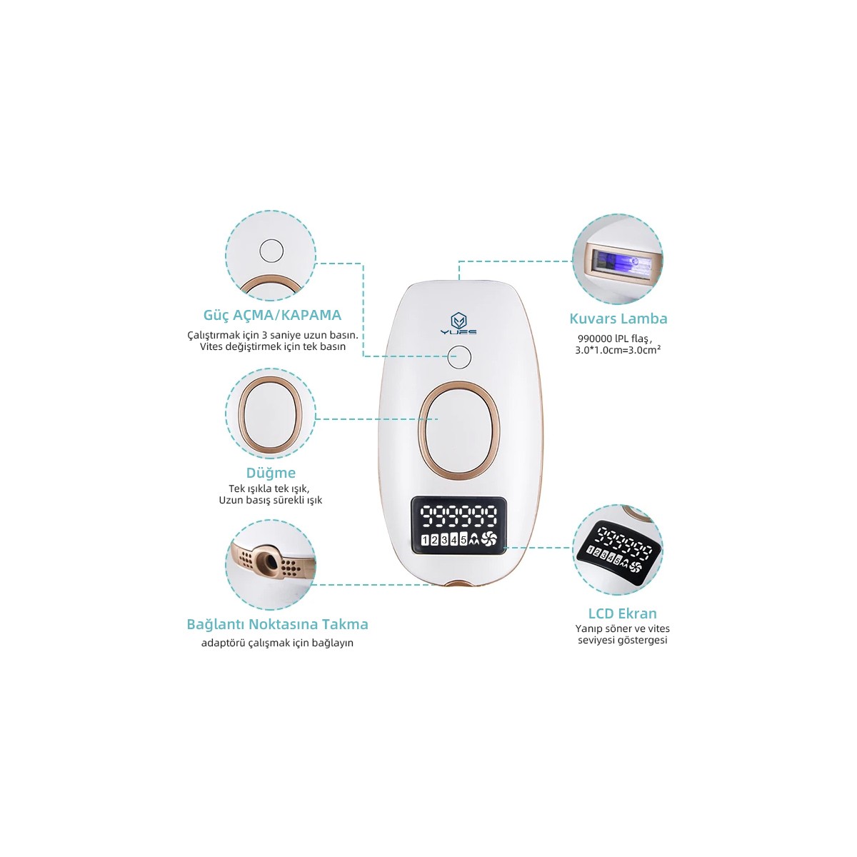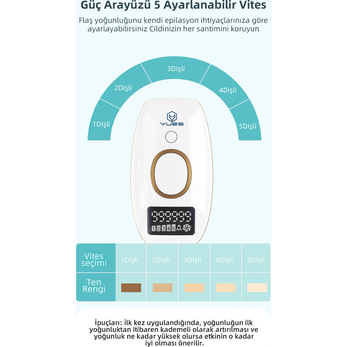 Otomatik ve Manuel Modları mevcuttur. Manuel Mod Kullanım alanları : Dudaklar / Koltuk Altı / Bikini Bölgesi Otomatik Mod Kullanım alanları : Kollar / Bacaklar / Göğüs Bölgesi5 Farklı Güç Ayarı999999 Flash AtımGlass LambaHızlı FlashEnerji :5-13J/CM2Wavelenght: 470-1100nm Ürün Açıklaması: İstenmeyen tüylerle vedalaşmanın en konforlu yolu YUES IPL Epilasyon Cihazı ile tanışın! Evde profesyonel bakım deneyimi sunan bu cihaz, güçlü ışık teknolojisiyle tüy köklerini hedef alarak kalıcı sonuçlar sağlar. Düzenli kullanımda daha az tüy ve daha pürüzsüz bir cilt vadediyor. Öne Çıkan Özellikler: •IPL Teknolojisi: Klinik onaylı yoğun atımlı ışık teknolojisiyle etkili ve kalıcı sonuçlar. •Cilt Tipine Uyumlu: 5 farklı enerji seviyesiyle her cilt tipi ve hassasiyetine uygun kullanım. •Hızlı ve Pratik: Geniş uygulama başlığı sayesinde dakikalar içinde kol, bacak, yüz, bikini bölgesi gibi alanlarda kullanım. •Uzun Ömürlü Kullanım: 999999 ışık atımı ömrüyle yıllarca kullanım imkânı. Kullanım Alanları: Yüz, koltuk altı, kollar, bacaklar, bikini bölgesi gibi çeşitli bölgelerde güvenle kullanılabilir. Neden [Marka Adı] IPL Cihazı? •Ev konforunda profesyonel sonuçlar •Zaman ve maliyet tasarrufu •Cilde zarar vermeden etkili uygulama Şimdi YUES ile pürüzsüz bir geleceğe adım atın!
