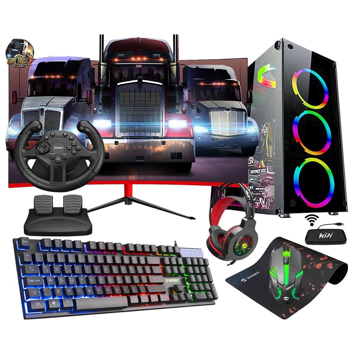- 1 Adet kasa (Güç Kablosu Dahil), 1 Adet Monitör (Güç kablosu ve HDMI Kablosu Dahil), 1 Adet Oyuncu Klavyesi, 1 Adet Oyuncu Mouse, 1 Adet Mousepad, 1 Adet Oyuncu Kulaklık, 1 Adet USB Wifi Adaptörü, Garanti Belgesi