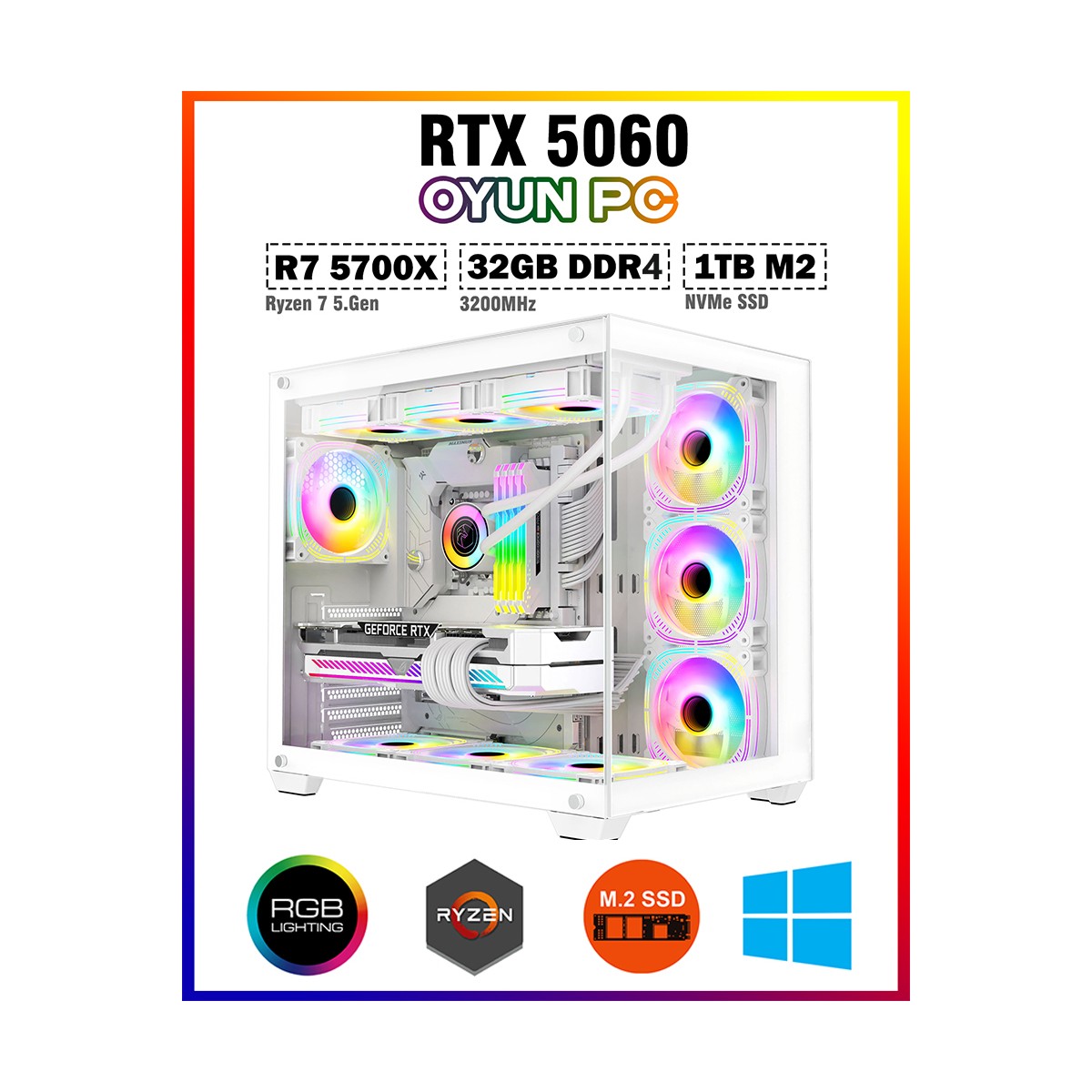 - Zeiron Mirage X50 Pro White Ryzen 7 5700X 32GB 1TB M.2 SSD RTX5060 2 Fanlı Sıvı Soğutmalı 2 Fanlı Ekran Kartı Premium Oyuncu Bilgisayarı