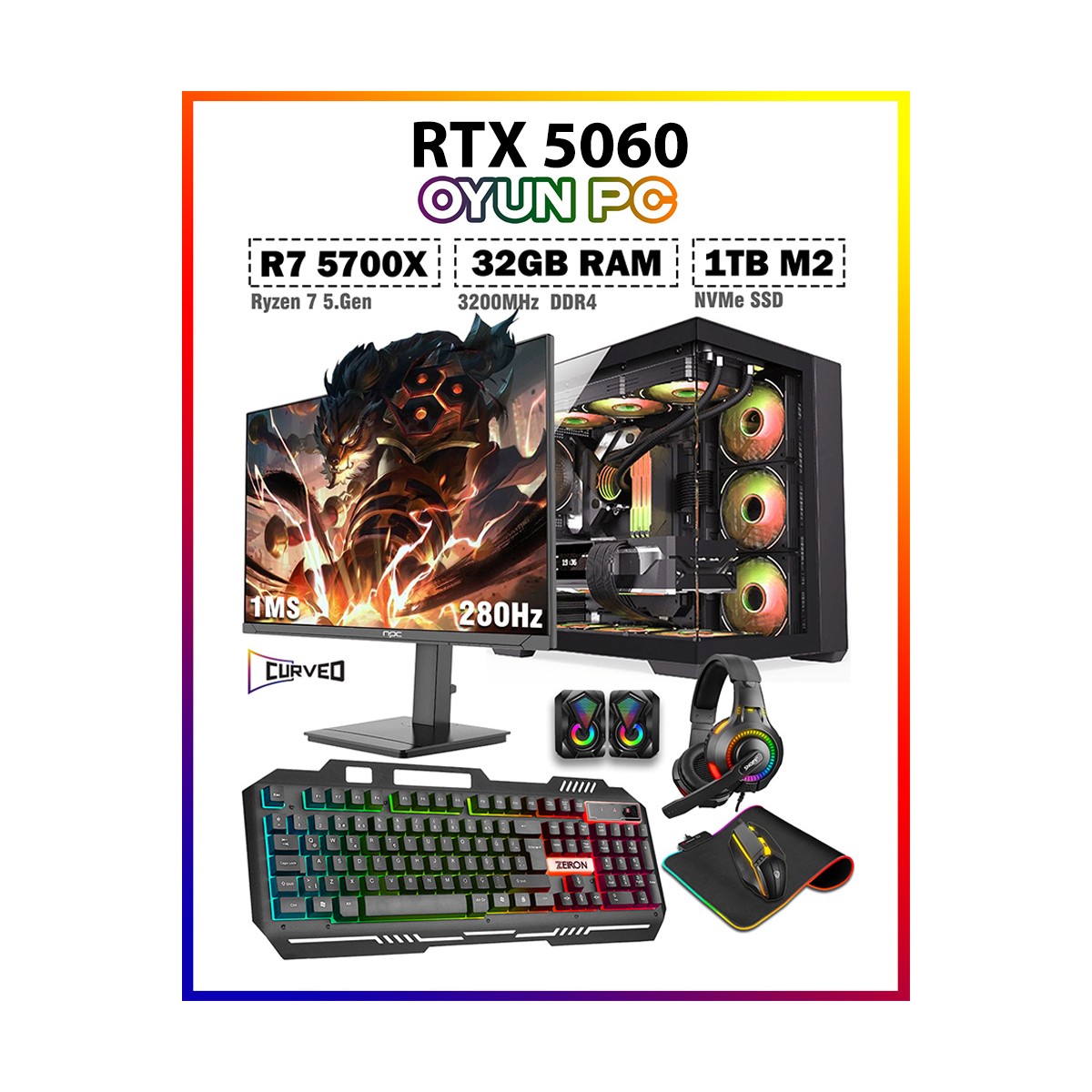 - Zeiron Warrior Eagle X55 Ryzen 7 5700X 32GB 1TB M.2 SSD RTX5060 27″ 280Hz 2 Fanlı Sıvı Soğutmalı 2 Fanlı Ekran Kartı Premium Oyuncu Bilgisayarı